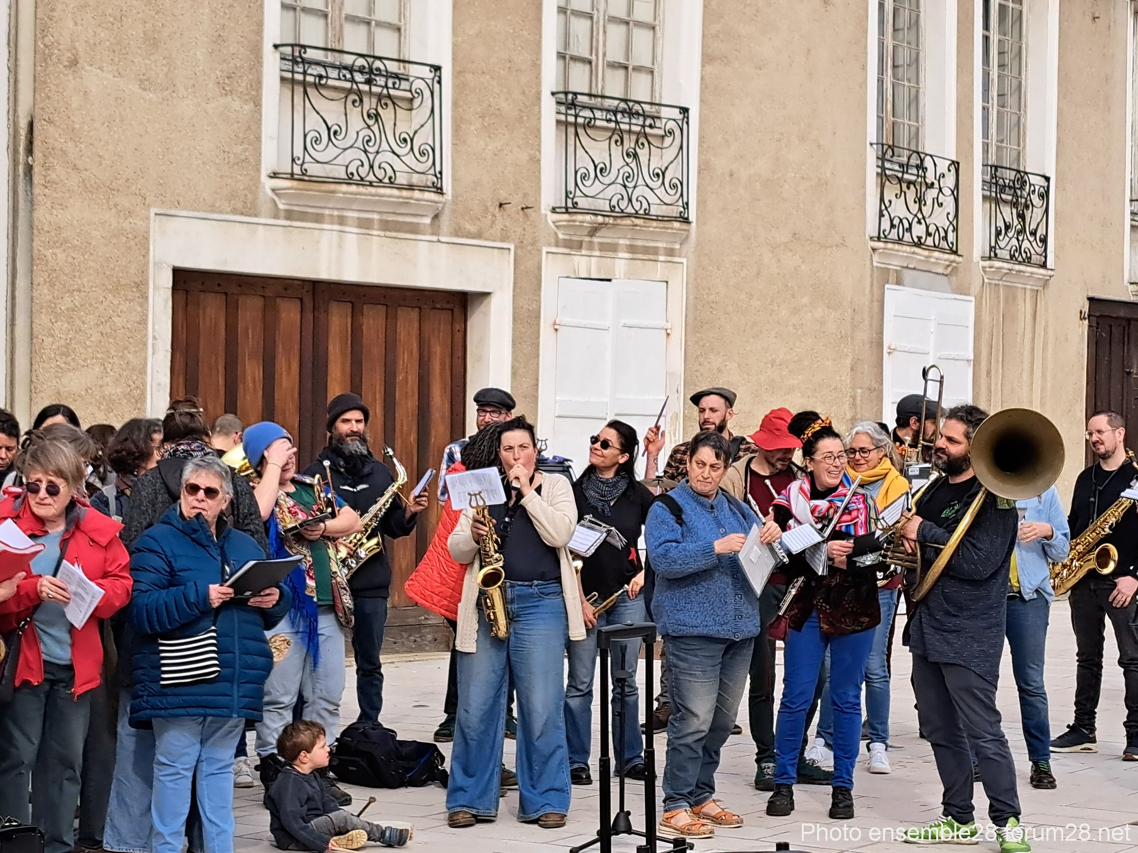 La Fanfare invi­sible du Perche et des chan­teuses et chan­teurs ama­teurs ont fait entendre les espoirs et les luttes des femmes d’ici et d’ailleurs et de périodes his­to­riques dif­fé­rentes, devant un public varié atten­tif aux textes. La qua­li­té du tra­vail réa­li­sé par les cho­ristes ama­teurs soli­daires a été remarquée.