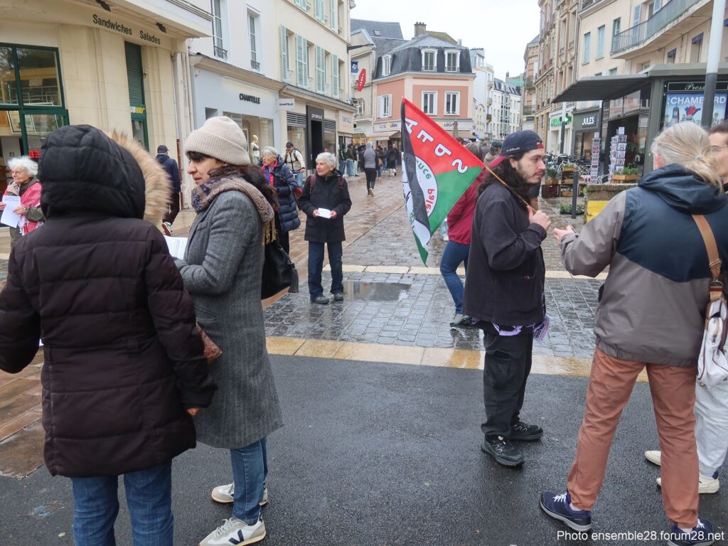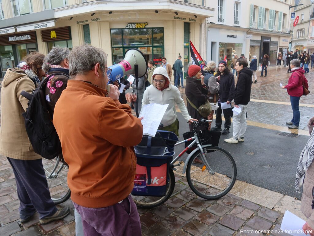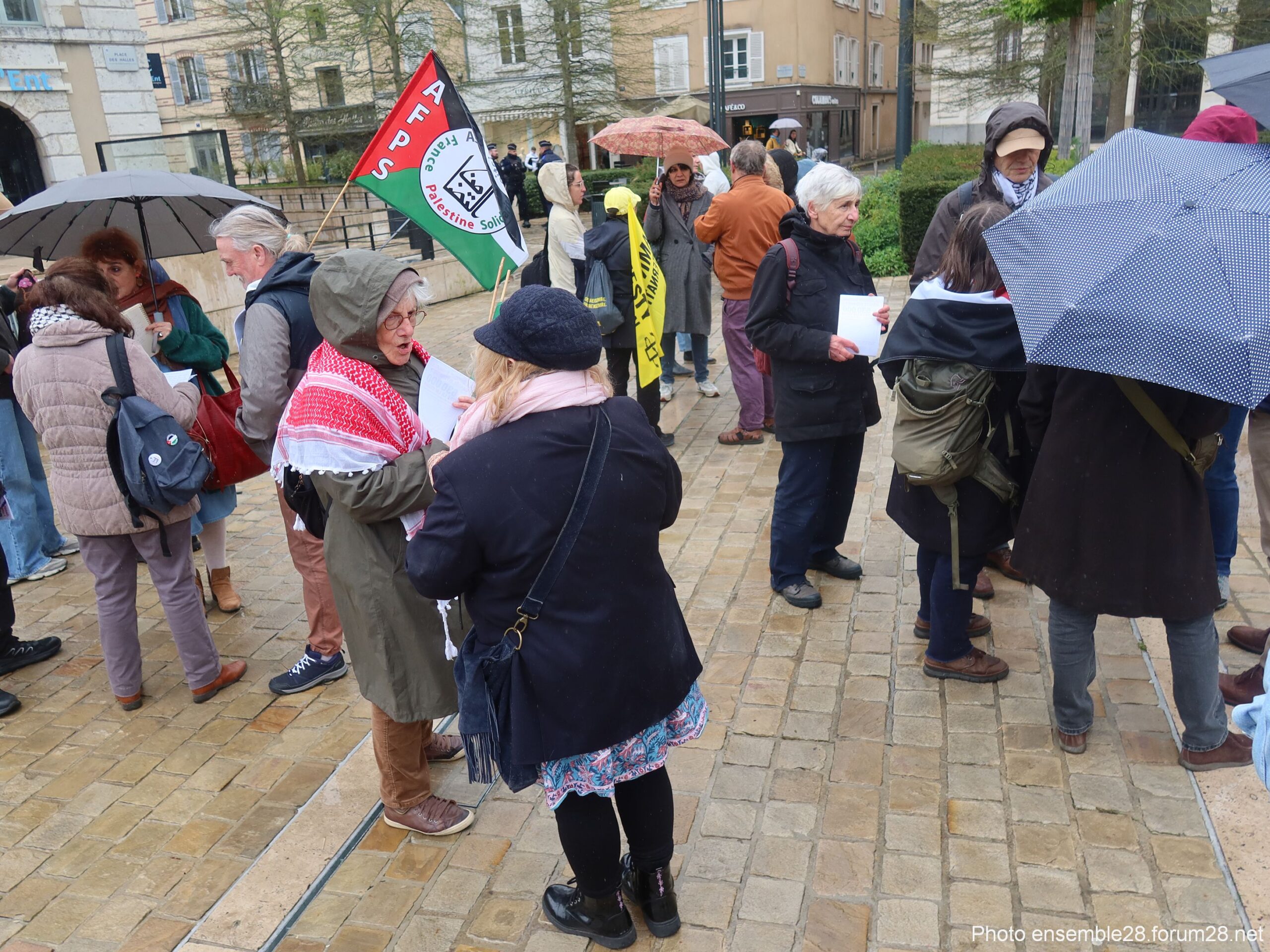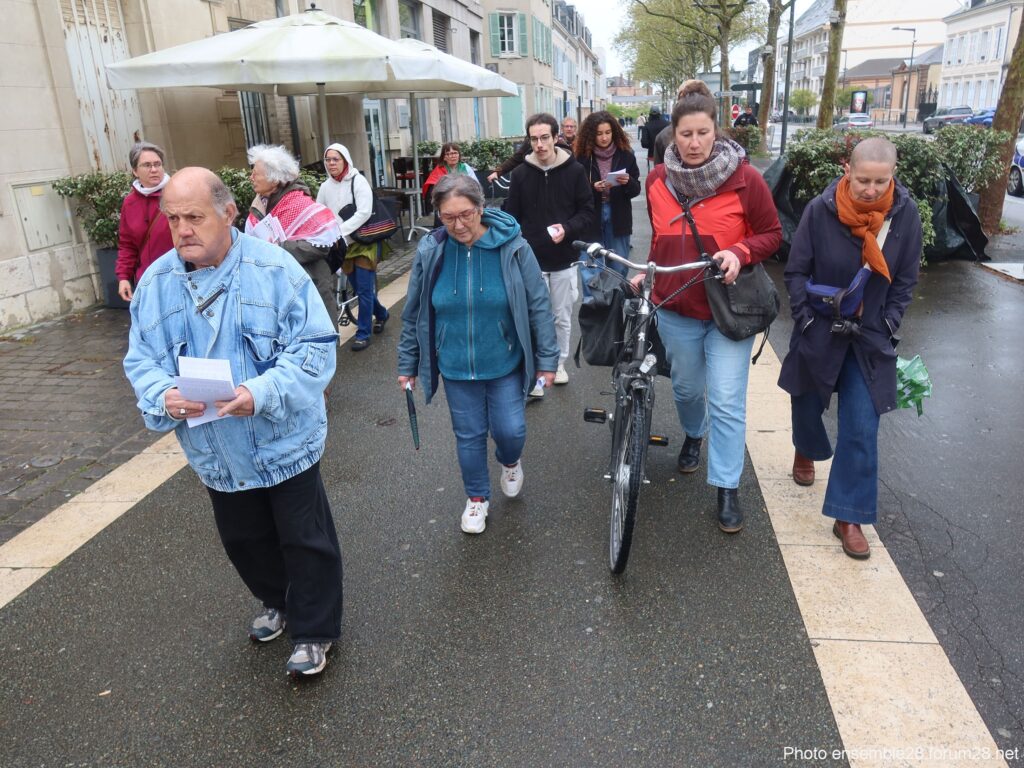 Le groupe s’est ensuite rendu sur la place des Épars où Christophe Pénicaud a pris la parole au nom du groupe de Chartres d’Amnesty International soulignant que : ‘’en confondant délibérément haine raciale et et critique politique, affaiblit objectivement la lutte contre l’antisémitisme réel. Assimiler la communauté juive de France à la politique du gouvernement Netanyahu c’est […] nier l’existence des nombreuses voix juives qui s’opposent à cette politique, en France comme partout dans le monde.’’