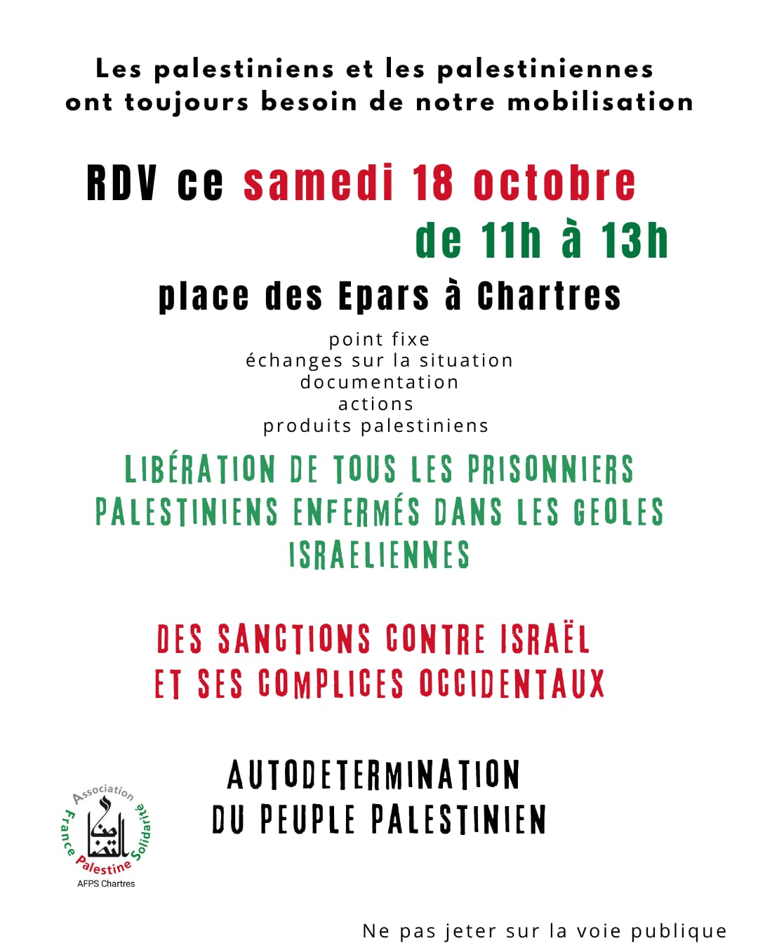 L'Association France Palestine Solidarité (AFPS) de Chartres sera présente sur la Place des Épars à Chartres, samedi 1er novembre, pour la troisième semaine consécutive. Une table sera installée sous un petit barnum avec des documents, des produits de Palestine pour concrétiser sa solidarité, des informations et analyses. Les adhérent·e·s échangeront avec les habitant·e·s de l'agglomération chartraine sur la situation dans la Bande de Gaza dévastée et les espoirs fragiles de paix. Les questions et les avis peuvent diverger, l'échange est indispensable dans un contexte national et international entre guerres et montée des régimes intolérants…